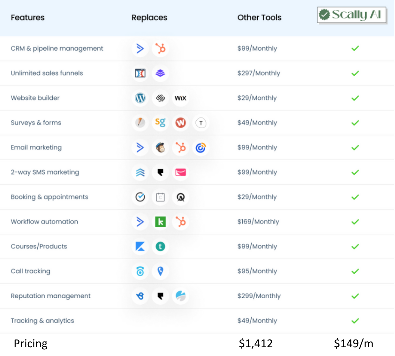 A diferencia de otras herramientas que solo resuelven una parte del proceso, Scally AI integra todo tu sistema de marketing, ventas y automatización en un solo lugar.
